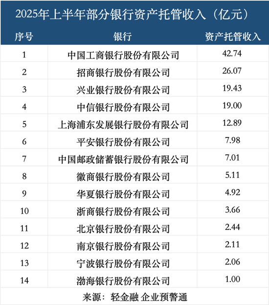 公布资产托管业务收入的银行中,工行最高,超过了42亿元,招行超过26亿元,此外,兴业银行、中信银行的托管收入也接近20亿元。